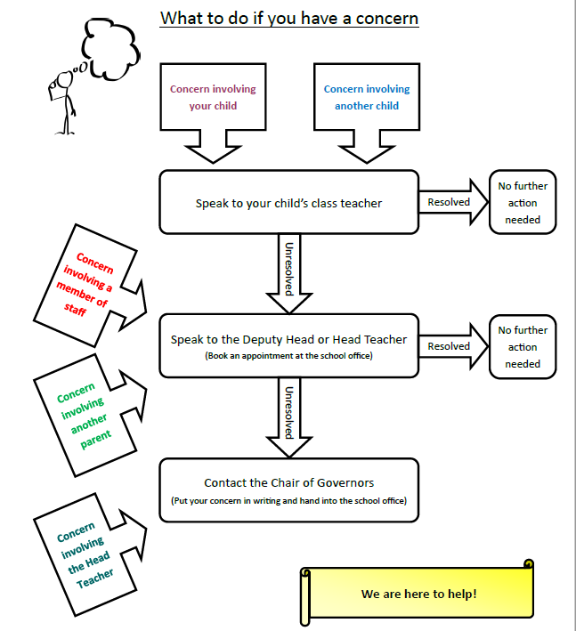 We work very hard to build positive relationships with all parents and keep communication open to resolve any concerns raised. If you are a parent or carer with a concern about your own or another child, we ask that you first speak to your child’s class teacher. In our experience, most issues are resolved at this level.